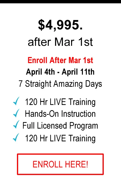 If at anytime up until the END OF THE FIRST NIGHT you’re unhappy for any reason, we will gladly return your investment, (minus our $100. admin fee’s.) You have ONE full day to confirm the decision you made with us. (If you don't say anything during that first day, we'll assume you comply with our certification program and decided to stay the entire 7 day course... And as a reward, you'll get a RETURN FOR FREE ticket to attend another practitioner course... how would you like that?